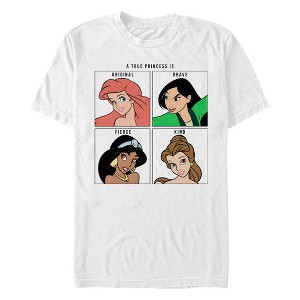 • Strut your stuff with this stylish new men's graphic t-shirt that is perfect for every occasion! Featuring a cool graphic of Ariel, Mulan, Jasmine, and Belle in different icon boxes with adjectives written in each square and the phrase: "A True Princess Is" printed above.