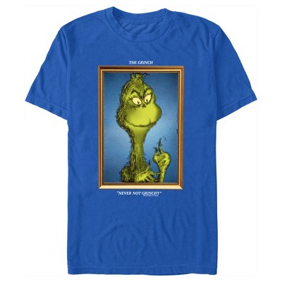 • Strut your stuff with this stylish new men's t-shirt that is perfect for every occasion! Featuring a gold-framed painting of Mr. Grinch smiling across the front with the phrase: "Never not Grinchy," below.