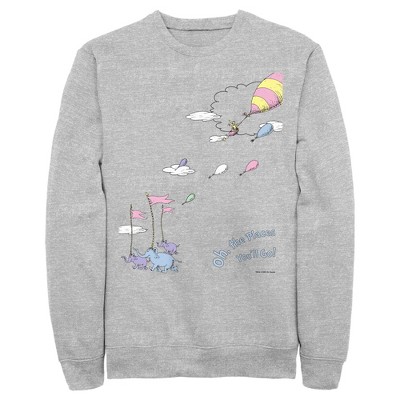 Welcome to the fantastical world of Dr. Seuss! Celebrate the most beloved childhood classic books and movies from every generation with fun new officially licensed apparel for the entire family! This Men's Dr. Seuss Oh The Places You'll Go Book Cover Graphic Crewneck Sweatshirt features the cover for the book "Oh The Places You'll Go" across the front. Get ready for the rhyming and whimsy of Seussville with these classic sweatshirts today!