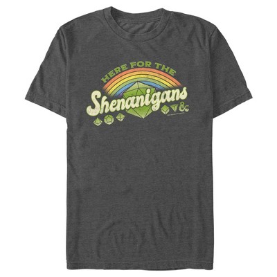 • Strut your stuff with this stylish new men's t-shirt that is perfect for St. Patrick's Day celebrations! Featuring all of the D&D dice with a rainbow above them and the phrase: "Here for the Shenanigans."