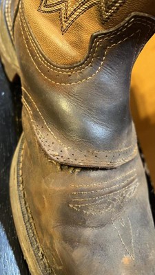 The upper of this Rebel by Durango Western boot is made with full-grain leather. It features detailed stitching on the tan shaft and a classic toe bug stitch on the brown foot. With a dipped topline and easy pull-on finger holes, getting these 11 square-toe boots on and off is no problem.Inside, a soft mesh lining adds breathability, while the contoured footbed cushions your step. It’s ventilated to help keep your feet cool and removable so you can swap it out when needed.For added support, there’s a tempered steel shank that helps keep you steady and supports your arches. A double row sole stitch adds durability and reinforces the overall build of the boot.The outsole is made from a flexible, lightweight blend of rubber and EVA, giving you all-day comfort without the bulk. It’s also slip, oil and abrasion-resisting, so it holds up well on different surfaces. A 1 1/2 rocker heel gives just the right amount of lift while keeping your stride comfortable and stable.With a rugged look, solid construction, and all-day comfort, these Rebel by Durango Saddle Up Western Boots are a great choice for work or everyday wear.