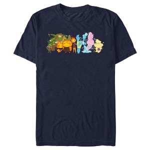Discover what happens when opposites react! Join Ember, Wade, and all their friends in a city where the elements of fire, water, land, and air all live together in Disney's all-new computer-animated feature film Elemental! This Men's Elemental Group Portrait Graphic T-Shirt features a fun and colorful group portrait of earth elements Clod and Fern Grouchwood, fire elements Cinder Lumen, Bernie Lumen, and Ember Lumen, water elements Wade Ripple, and Brook Ripple, and air elements Gale Cumulus and Lutz across the front.