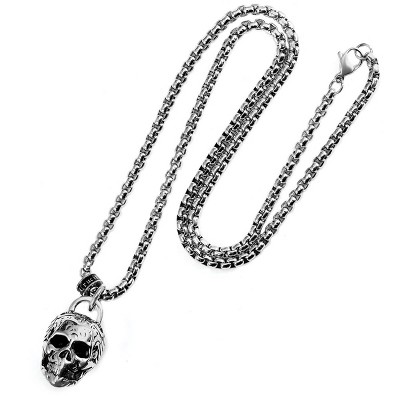 Stainless Steel 35mm Skull Necklace on 28 Inch 5mm Box ChainWear this heavy eye-catching skull pendant and create a bold look. The well detailed skull is crafted with durable steel and has a weight of around 166 grams. Enough to create a statement itself. Measuring from the top of the bail to the bottom of the skull pendant, the length is 62mm or 2 7/16 inches. The length of the solid skull itself is 35mm or 1 inch. The width of the skull is 24mm or 15/16 inches. The pendant is paired with a 28 inch box chain that has a width of 5mm or 3/16 inches and fastens with a lobster claw clasp.