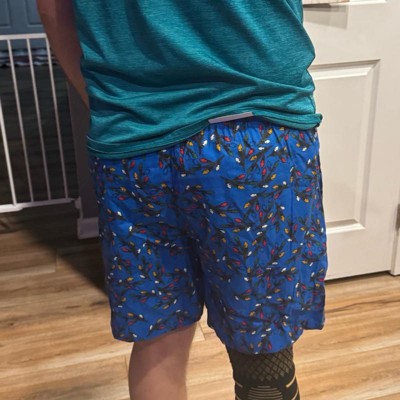 [This review was collected as part of a promotion.] My husband is 5 foot 9 inches tall, weighs approximately 195 lbs, and tried on the size large in these flannel sleep pajama shorts from Goodfellow & Co. He likes them a lot! The design is Christmas lights on the pretty blue background. They are very comfortable and the fit is great. He would say they fit pretty true to size. Nice festive shorts!