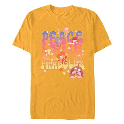 Prepare to experience the joy and excitement of Fraggle Rock like never before with this new officially licensed apparel for the whole family! Step into the vibrant world of your favorite characters and bring their hilarious adventures to life with this Men's Fraggle Rock Peace and Love Graphic T-Shirt featuring Mokey, Boober, Red, Gobo, and Wembley adorning the words "Peace Love Fraggles," along with stars and musical notes across the front. Don't miss out on the chance to show off your love for this classic TV series, so grab this awesome design today and dance your cares away in style!