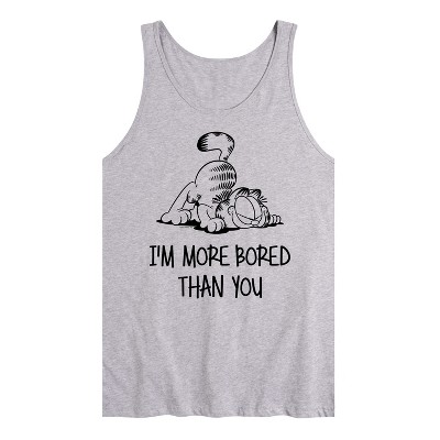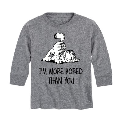 Garfield - More Bored Than You - Men's Long Sleeve T-Shirt - Bring the humor and laziness of the famous orange cat to your wardrobe with Garfield graphic apparel. Featuring Garfield, Odie, and Jon, these designs celebrate the iconic comic strip and its beloved characters.