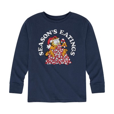 Garfield - Seasons Eatings - Adult Long Sleeve Tee - Bring the humor and laziness of the famous orange cat to your wardrobe with Garfield graphic apparel. Featuring Garfield, Odie, and Jon, these designs celebrate the iconic comic strip and its beloved characters.