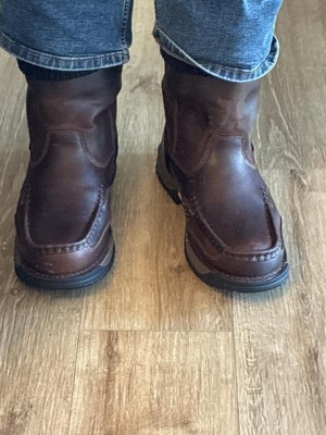 The Athens 360 waterproof men's pull-on work boot by Georgia Boot is equipped with both supreme comfort and rugged performance features. It has a 360-degree stitch out construction with a reinforced toe stitch to prevent sole separation.The full-grain leather upper has a Shaped rear shaft for added flexibility, the Counter Lock System to secure your heel in place, and leather pull straps for an easy on.The interior on this waterproof work boot is armed with our Georgia Waterproof System, designed to keep water and muck out while remaining breathable. A high-performance mesh material lines the inside. Our Comfort Core Next Gen memory foam insole is removable and features individual Comfort Core pillars that flex and absorb shock as you move.The heat, , abrasion, slip and oil-resistant dual density Carbo-Tec Rubber outsole has a cushioning EVA midsole and fiberglass shank for added durability. It also includes a TPU 360 Anchor Disk for added arch support and stability. This moc toe pull on work boot meets ASTM F2892 electrical hazard standards for soft toe work boots. Buy your pair today.