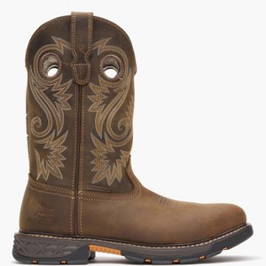 A lightweight and flexible fit that bends to meet the hefty demands of your day. The Carbo-Tec FLX alloy toe waterproof pull-on is Georgia Boot's newest 11-inch square toe western work boot. It features our ultra-comfortable AMP (advanced memory polyurethane) insole. This 11-inch full-grain leather brown pull-on Western boot is equipped with leather pull loops and our FLX-FIT technology on the rear for easy on and off. Inside, you will find a high performance mesh lining and the Georgia Waterproof System. Our waterproofing is guaranteed to defend against water coming into your boot when working in wet conditions. The EVA midsole, the double-wide fiberglass Shovel Shank XL, and the rubber outsole are attached to the upper through a flexible Cement Construction. Our Carbo-Tec outsole is not only oil and slip-resistant but possesses great abrasion, and heat resistant properties as well. This boot meets ASTM 2413 electrical hazard standards and impact and compression standards for safety toe work footwear.