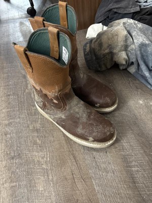 These wellington work boots are highly durable and feature special leather.The SPR leather resists caustic chemicals and barnyard acids. It has 3 times the strength and it is able to resist abrasions 2 ½ times better than traditional leathers because of the way it has been tanned.These men's work boots have welt construction. By building the footwear this way it gives them durability and strength; plus it allows you to have the outsole replaced once it has worn down.Pull loops at the top of the pull-on boots help you get into them each day. Inside is a soft lining and a cushion insole, both of help make these comfortable work boots.A steel shank supports the arch of your foot and enables you to have steady footing. The work boots have a Poly Wedge Ultra outsole; it's lightweight, provides great cushioning and flexibility, and resists chemicals and oils.Georgia Boot Farm & Ranch Wellingtons are tough work boots that you can wear anywhere, and they're extremely comfortable. Pull on these 10-inch boots; you'll never want to work in anything else again.