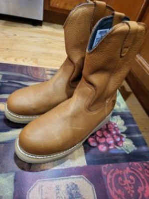 These wellington work boots are highly durable and feature special leather.The SPR leather resists caustic chemicals and barnyard acids. It has 3 times the strength and it is able to resist abrasions 2 ½ times better than traditional leathers because of the way it has been tanned.These men's work boots have welt construction. By building the footwear this way it gives them durability and strength; plus it allows you to have the outsole replaced once it has worn down.Pull loops at the top of the pull-on boots help you get into them each day. Inside is a soft lining and a cushion insole, both of help make these comfortable work boots.A steel shank supports the arch of your foot and enables you to have steady footing. The work boots have a Poly Wedge Ultra outsole; it's lightweight, provides great cushioning and flexibility, and resists chemicals and oils.Georgia Boot Farm & Ranch Wellingtons are tough work boots that you can wear anywhere, and they're extremely comfortable. Pull on these 10-inch boots; you'll never want to work in anything else again.