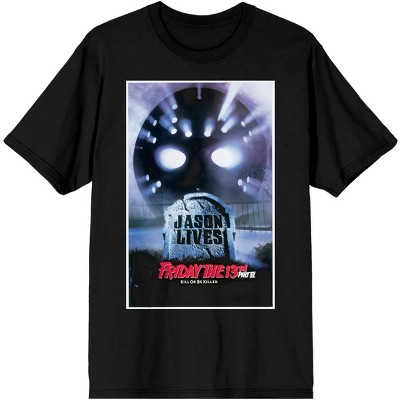 • GRAPHIC TEE: This shirt replicates the movie poster for Jason Lives. Jason's face covered with a hockey mask against an eerie gray background is a perfect way to embrace your love for the Friday movie collection.