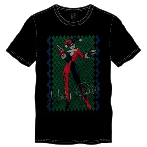 Show off your love of Harley Quinn in this cool graphic design tee. Features full length and color Harley sporting her guns against a checkered green and blue bold design background. This classic black t-shirt is soft and durable 100% cotton material made to last.