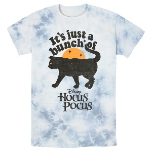 If you're looking for a little hocus pocus this Halloween, then look no further than this officially licensed Disney Hocus Pocus Binx Black Cat Men's Bombard Tie-Dye Graphic T-Shirt. You can light the Black Flame candle to awaken the Sanderson witches this Halloween, or you could just celebrate the holiday with this festive Hocus Pocus style instead! A distressed cartoon of your favorite black cat, Binx, is featured below the text "It's Just a Bunch of Hocus Pocus" on this funny Hocus Pocus tie-dye tee!