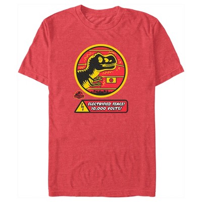 Have you seen the Jurassic World Warning Electrified Fence Heather Red T-Shirt? It's electrifying! This red graphic tee reads "Warning do not touch fence! Electrified fence throughout the park" next to a velociraptor and a lightning bolt, warning all Jurassic World visitors to be careful.