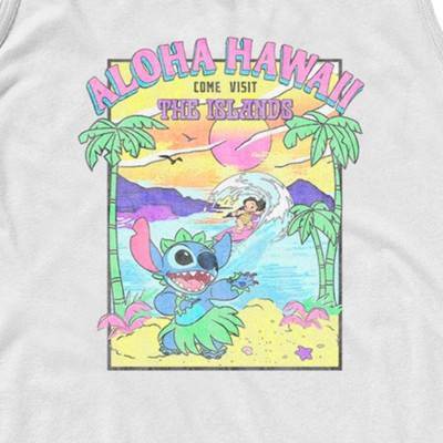 • Strut your stuff with this stylish new everyday Men's Tank Top that is perfect for every occasion! Featuring a colorful poster graphic with Stitch hula dancing, Lilo surfing in the back, and the text: "Aloha Hawaii Come Visit the Islands."
