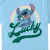 • Strut your stuff with this stylish new men's t-shirt that is perfect for St. Patrick's Day celebrations! Featuring a colorful sparkling rainbow, the word "Lucky" in distressed lettering below, and Stitch winking and smiling with a four-leaf clover in his hand.