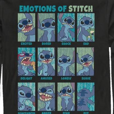 Ohana means family, and that means no one gets left behind with this officially licensed Disney Lilo & Stitch Emotions of 626 Men's Graphic Long Sleeve T-Shirt! This adorable Men's tee design features the text "Emotions of Stitch," with many panels showing his different moods like exited, disappointed, lonely, bored, sad, delight, amused, fear, and bye. Your popularity will skyrocket once you wear this new graphic tee, so grab one for yourself today!