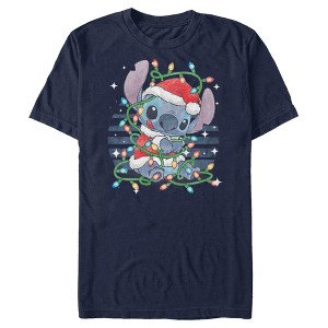 Ohana means family, and that means no tee gets left behind for Christmas with this officially licensed Disney Lilo & Stitch Playing with Lights Men's T-Shirt! This festive Men's design features an adorable Stitch trying to untangle himself from colorful Christmas lights while bright stars surround him. Your popularity will skyrocket once you wear this garment, so grab this new graphic tee for the holiday season and celebrate Christmas with style!