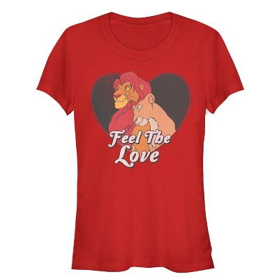 Can you feel the love tonight? The Lion King Simba and Nala Valentine Feel the Love Men's T-Shirt can! White letters spell out "Feel the Love" below Simba and Nala snuggling on this cool Disney shirt.