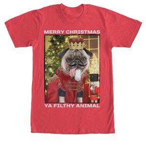 Prepare for the dance of the sugar plum fairies with the Lost Gods Christmas Nutcracker Pug Red T-Shirt! A pug dressed like a nutcracker is printed next to a nutcracker, a Christmas tree, and the words "Merry Christmas Ya Filthy Animal" printed on the front of this funny red Christmas shirt.
