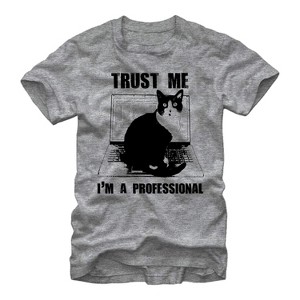 Cat got your computer with the Lost Gods Computer Cat Heather Gray T-Shirt? This awesome gray tee features a curious cat sitting on a laptop keyboard and the words "Trust me. I'm a professional" printed in black across the front.