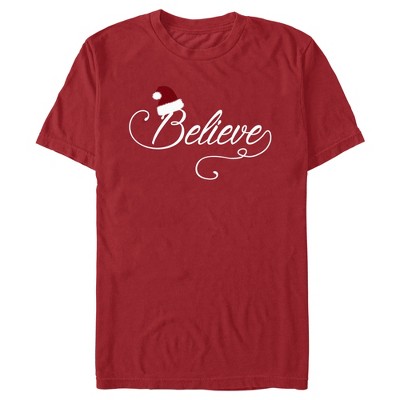 • Strut your stuff with this stylish new Christmas men's t-shirt that is perfect for the holidays! Featuring the word "Believe" wearing a Santa hat and written in script white font across the front.