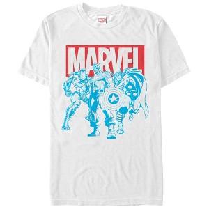 Evil doesn't stand a chance against the Marvel Avengers Stance White T-Shirt. This durable white Avengers shirt reads "Marvel" in red above a blue graphic of three iconic Avengers: Thor, Captain America, and Iron Man.