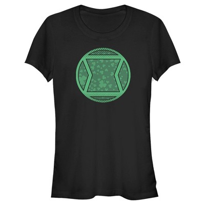 • Featured on this tee is Black Widow's logo with a green clover fill!