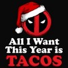 • Strut your stuff with this stylish new men's graphic t-shirt that is perfect for every occasion! Featuring a graphic of Deadpool's icon wearing a Santa hat with the phrase: "All I Want This Year Is Tacos" printed below.