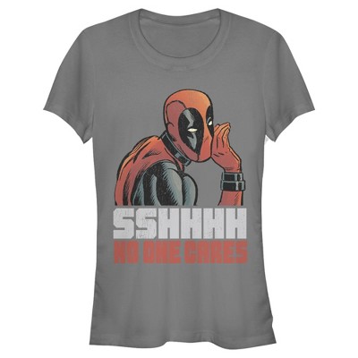 Deadpool only cares about one thing so don't even bug him about anything but the Marvel Deadpool No One Cares Men's T-Shirt. A distressed cartoon Deadpool is featured with "Sshhhh No One Cares" on this cool men's Deadpool tee.