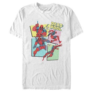 • Strut your stuff with this stylish new men's graphic t-shirt that is perfect for every occasion! Featuring four panels of Deadpool posing in front of colorful shapes in a retro-style design.