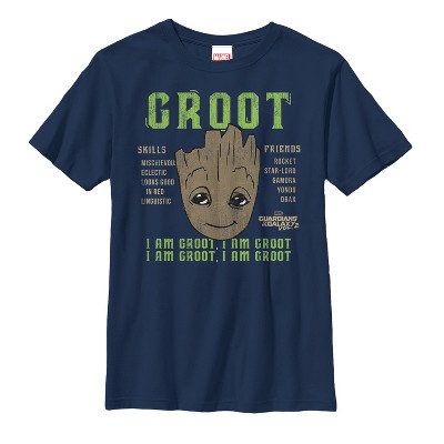 Groot has some mad skills and his amazing fashion sense is just one of them with Marvel Groot Guardians of the Galaxy Vol. 2 Skills Navy Blue T-Shirt! A distressed grinning Baby Groot is portrayed alongside a list of his "Skills" and "Friends" on this funny blue Groot shirt.