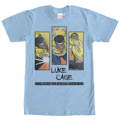 Need a superhero but don't know where to turn? Look no further than the Marvel Heroes for Hire Kawaii Heather Light Blue T-Shirt! Kawaii cartoon versions of Spider-Woman, Luke Cage, Iron Fist, and Daredevil are printed in four boxes on the front of this awesome blue Heroes for Hire shirt.