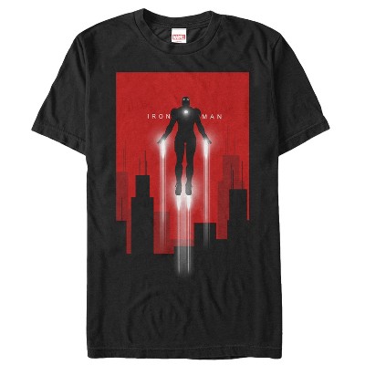 Tony Stark's mechanical engineering prowess helped him create unstoppable armor on the Marvel Iron Man in Flight Black T-Shirt! A silhouette of Iron Man jetting into the sky, with a bustling metropolis behind him, is printed on a red background on this black Marvel shirt.