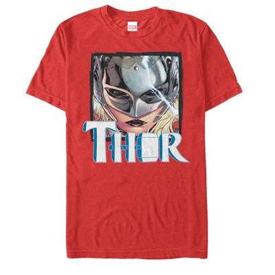 Summon down the elements of a storm with the Marvel Mighty Thor Thunder Red T-Shirt! This awesome red shirt shows a comic book-style Thor, the son of the Earth goddess Gaea, flying through the air with his powerful hammer, Mjolnir, and shooting electric currents and thunderbolts from his body.