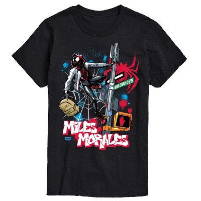• Strut your stuff with this stylish new men's t-shirt that is perfect for every occasion! Featuring Miles Morales and Spider-Gwen swinging across the front with a glitch effect in the background.