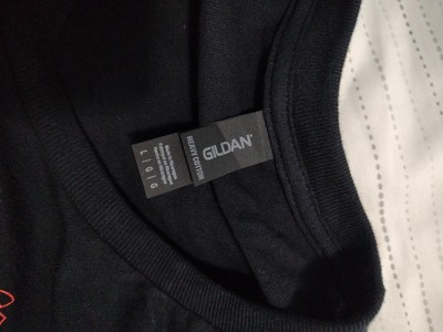 shirt is average material kinda cheap. Gildan brand. the print on the shirt is okay but not worth its price over 24 dollars. probably buy it when it's on sale. if it a hefty guy and you usually get a large I recommend getting an XL for a more loose fit