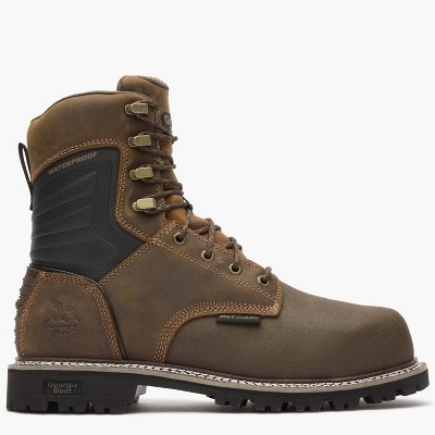 The Georgia Boot Brute men's collection has all of Georgia's top-notch safety and performance features packed into one tough boot. Protective features of this boot include a soft ANTI-Impact internal metatarsal guard that hardens upon impact, an Ergo-Fit nano composite toe cap, and a Tec-Tuff leather vamp for high-abrasion resistance. This 8 inch brown work boot features an abrasion-resisting solid rubber outsole with multi-directional 6mm lugs and a Welt construction with a reinforced toe stitch for added durability. Internal features include a guaranteed waterproof system lined in a soft performance mesh material and a removable AMP LT memory foam insole. This safety toe work boot meets ASTM F2413 protective toe classification, ASTM F2413 electrical hazard classification, and ASTM F2413 metatarsal guard classification.