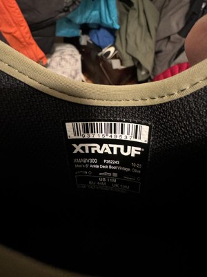 The Ankle Deck Boot collection, by XTRATUF, has a lightweight design with the same slip-resisting Chevron outsole found on the Legacy boot collection. The Vintage line of ankle boots features vintage colors with nautical rope-inspired pull tabs. These 6-inch waterproof rubber boots have an XPRESSCOOL cooling liner that keeps feet comfortable in both cool and warm environments. An SRA-rated, slip-resisting outsole composed of an an exclusive rubber compound grips the floor surface, providing sure footing. This boot is constructed with hand-layered rubber, and so not classified as an XTRATUF commercial grade boot. For those looking for a commercial grade ankle height deck boot please search for the XTRATUF Wheelhouse Boot.