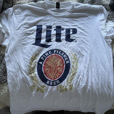 • It's Miller time with this Miller Lite Men's White T-Shirt! Enjoy this distressed Miller Lite t-shirt that reads "Lite A Fine Pilsner Beer" encircling the logo across the front. This beer tee will be sure to help you relax after a long day at work!