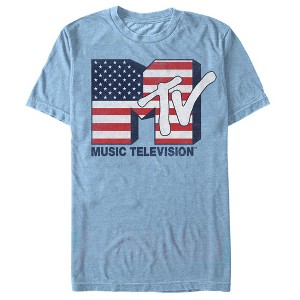 Show off your love for the American music with the MTV USA Flag Heather Light Blue T-Shirt! The stars and stripes of the American flag fill up the classic MTV logo printed in a slightly distressed style on the front of this cool blue MTV tee.