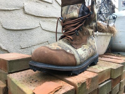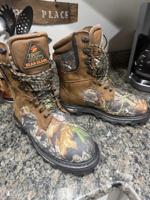 If you have been trying to find a camouflage hunting and outdoors boot that will keep your feet both dry and warm, this 9 Rocky BearClaw (#9275) boot may be just what you are seeking. With its strong full-grain brown leather and Mossy Oak Break-Up camouflage print (over durable nylon); the look of this boot will surely take your overall hunting experience to a whole new level. An invaluable feature of this hunting boot is its GORE-TEX membrane. This fabric so exceptional because it is breathable, waterproof, and prevents moisture from entering these boots. Regardless of the weather conditions or your surroundings, you'll be glad that you have this feature keeping your feet dry and comfortable. The temperature dropping isn't going to stop you from wanting to go hunting, which is why these BearClaw 3D boots have 1000 grams of Thinsulate Ultra Insulation. Your feet will be kept warm, even in extremely cold conditions, but the insulation won't add bulk to the inside of your boots. For more comfort internally, you'll be walking on the Air-Port cushion footbed. This is not your typical footbed; it is shock absorbing, supports and cushions, and promotes air to circulate each time you take a step. Your feet will be at ease throughout the entire hunting season. On the bottom is the BearClaw 3D outsole with ROCKY 3D welt construction; it's durable and allows you to walk across rough terrain with absolute ease. Now, get outdoors in these Rocky BearClaw 3D hunting boots!