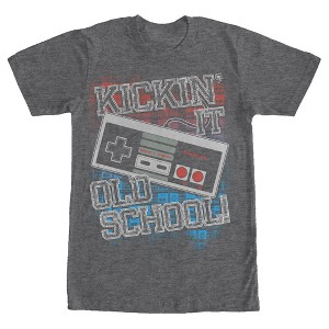 Take a trip down memory lane with the Nintendo Kicking it Old School NES Controller Heather Charcoal T-Shirt. An iconic Nintendo Entertainment System controller is printed on the front of this awesome Nintendo shirt with the words "Kickin' It Old School" printed around it.