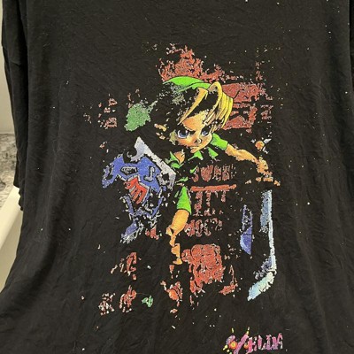 Join Link and save Termina from impending doom with the Nintendo Legend of Zelda Link Dash Black T-Shirt! Link runs across the front of this awesome black shirt with a unique text filled backdrop and the Legend of Zelda: Majora's Mask 3D logo below.