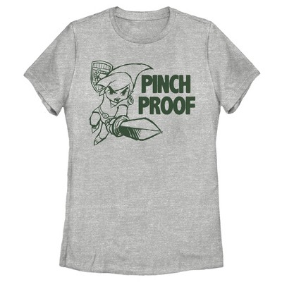 It's dangerous to go alone on St. Patrick's Day, take this Nintendo Legend of Zelda Link Pinch Proof Men's Tee! Link is encircled by "Pinch Proof" on this funny Nintendo tee.
