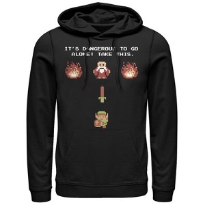 These days it may be a meme but the Nintendo Legend of Zelda Take This Men's Lightweight Hoodie has its roots in classic video games. Sport the famous quote "It's dangerous to go alone! Take this" and a scene from the 1986 video game The Legend of Zelda, played on the NES.