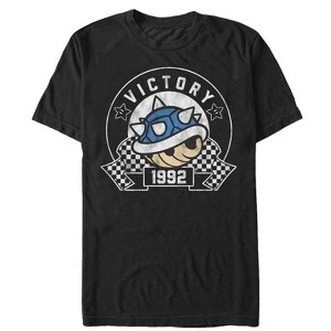 Power up with the Nintendo Mario Kart Blue Shell Men's T-Shirt! A distressed graphic reads "Victory 1992" alongside a blue shell or the "spiny Shell" on this fun Nintendo tee.
