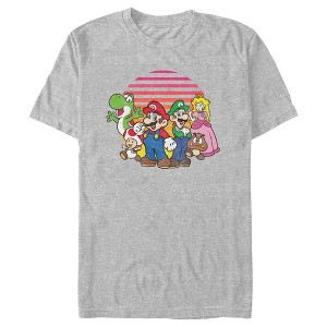 • Strut your stuff with this stylish new men's t-shirt that is perfect for every occasion! Featuring Mario, Luigi, Princess Peach, Yoshi, and Goomba striking their best poses with a cool retro sunset printed behind them.
