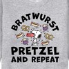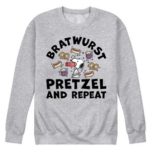 Peanuts - Bratwurst Pretzel And Repeat Snoopy - Men's Crew Neck Fleece Pullover - From the best-loved comic strip in history comes officially licensed PEANUTS apparel for fans everywhere. Show your love for Charlie Brown, Snoopy, Woodstock, Lucy, Linus, Pigpen and the whole gang. Copyright Peanuts.